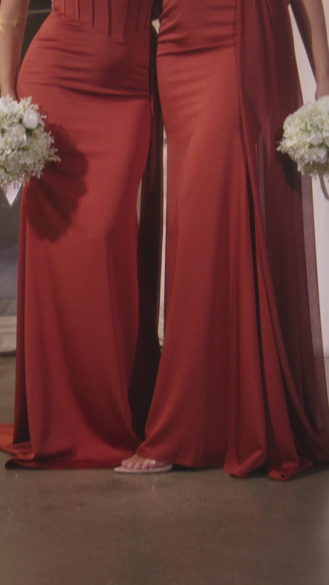 Introducing the Claire, a striking strapless design that combines timeless elegance with modern allure. Featuring visible boning for a structured, flattering fit, this form-fitting gown is crafted from luxurious satin fabric with soft chiffon draping. The dramatic side train adds an enchanting touch of movement and grace, making this gown as unforgettable as your special day. With medium stretch for added comfort, the Claire is the perfect choice for your bridesmaids to feel confident, stylish, and utterly radiant.