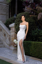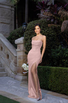 Introducing the Elena, a striking fitted floor-length dress that perfectly marries sophistication with a touch of daring. Featuring visible boning in the bodice for a beautifully structured look, this gown enhances your natural curves while providing a flattering fit. The delicate thin spaghetti straps add a graceful touch, and the alluring high slit ensures you can move with confidence and flair on the dance floor. Elena offers both comfort and elegance, making it the ideal choice for bridesmaids who want to shine. Step into this stunning gown and celebrate in unforgettable style alongside the bride!