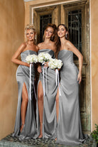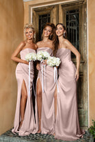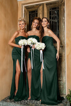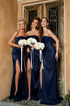 Introducing the Estelle, a show-stopping choice that perfectly balances sophistication and allure. This strapless fitted gown features a beautifully rouged bodice and hips, creating a flattering silhouette that enhances every curve. The daring high slit adds a touch of drama, while the subtle train at the back brings an elegant flow to each step. With a structured fit, the Estelle ensures your bridesmaids will radiate confidence and grace throughout your special day. Let them shine in the timeless beauty of the Estelle Gown!