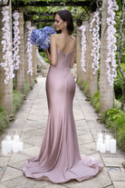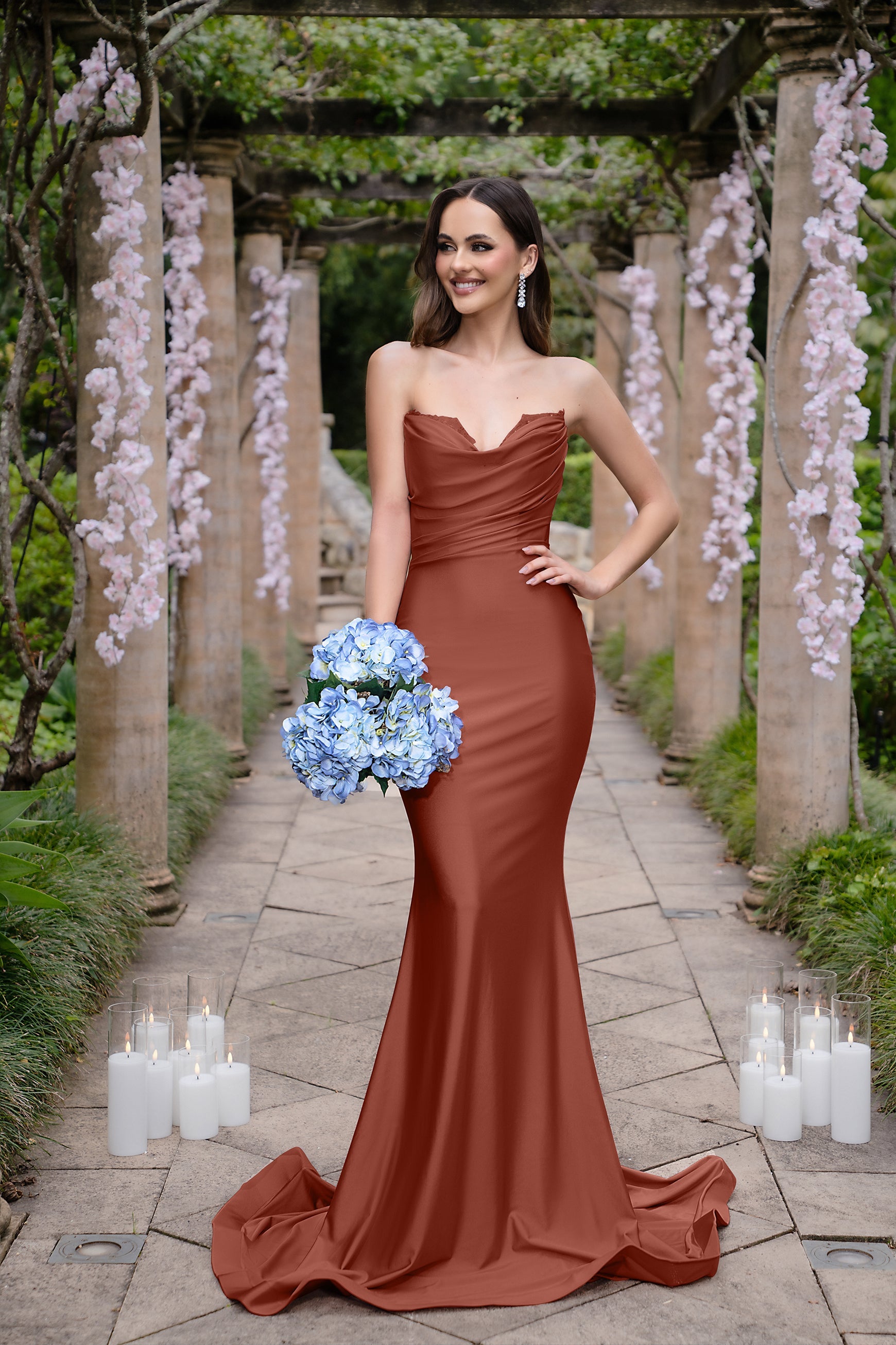 Introducing the Gabriella, a stunning choice for your bridal party that radiates elegance and charm. This strapless, sweetheart-shaped gown features a flattering mermaid silhouette that beautifully hugs the curves and flows into a subtle train at the back. Adorned with exquisite lace trim across the bodice, the Gabriella adds a touch of romance and sophistication. With its high stretch fabric, this gown ensures your bridesmaids will feel comfortable and confident while celebrating your special day. Let the Gabriella be the perfect blend of style and grace for your wedding!
