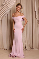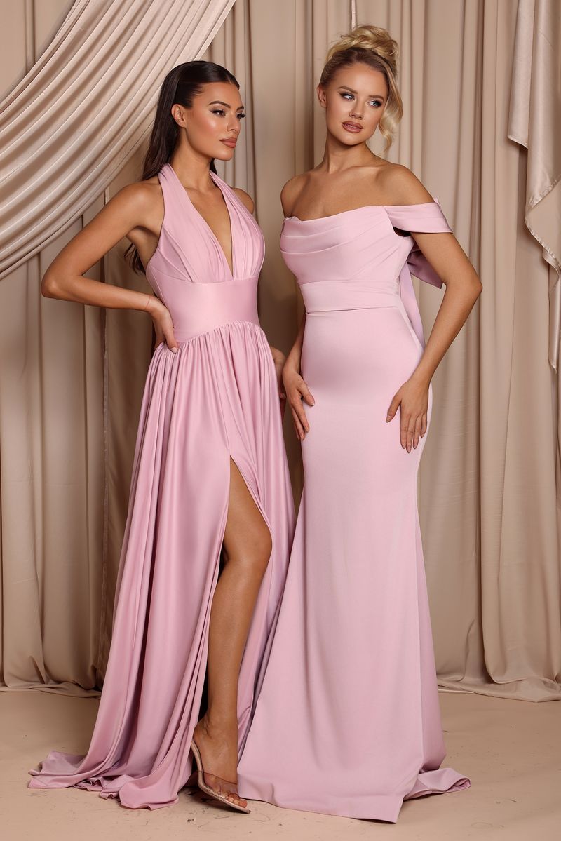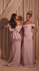 The Harper Gown is crafted from stretch satin and features an off-shoulder neckline with folded detailing for a sleek finish. The fitted silhouette highlights the figure, flowing into a soft train, while a statement bow at the back adds a romantic touch. A graceful and feminine choice for modern bridesmaids..