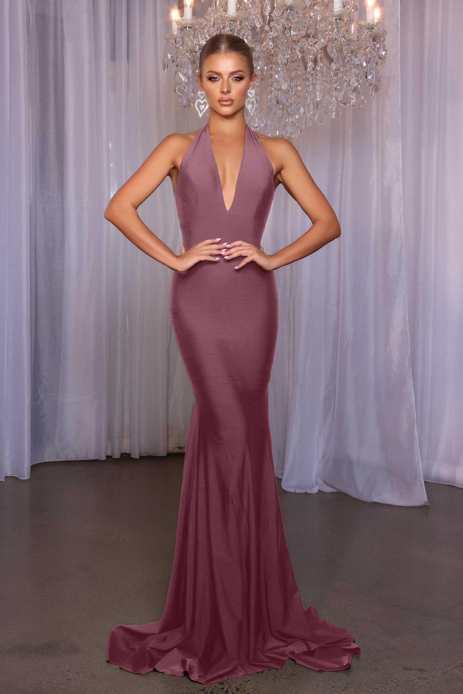 Introducing the Karla, a captivating floor-length dress that embodies elegance and style for your bridal party. Featuring a striking V front halter neck, this gown beautifully accentuates the shoulders while providing a flattering fit. The slight train adds a touch of drama, making it perfect for any wedding celebration. With a convenient center back zipper and high stretch fabric, the Karla offers both comfort and ease, allowing your bridesmaids to dance the night away with confidence. Elevate your wedding aesthetic with this stunning choice that combines sophistication and grace!