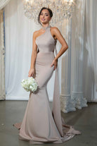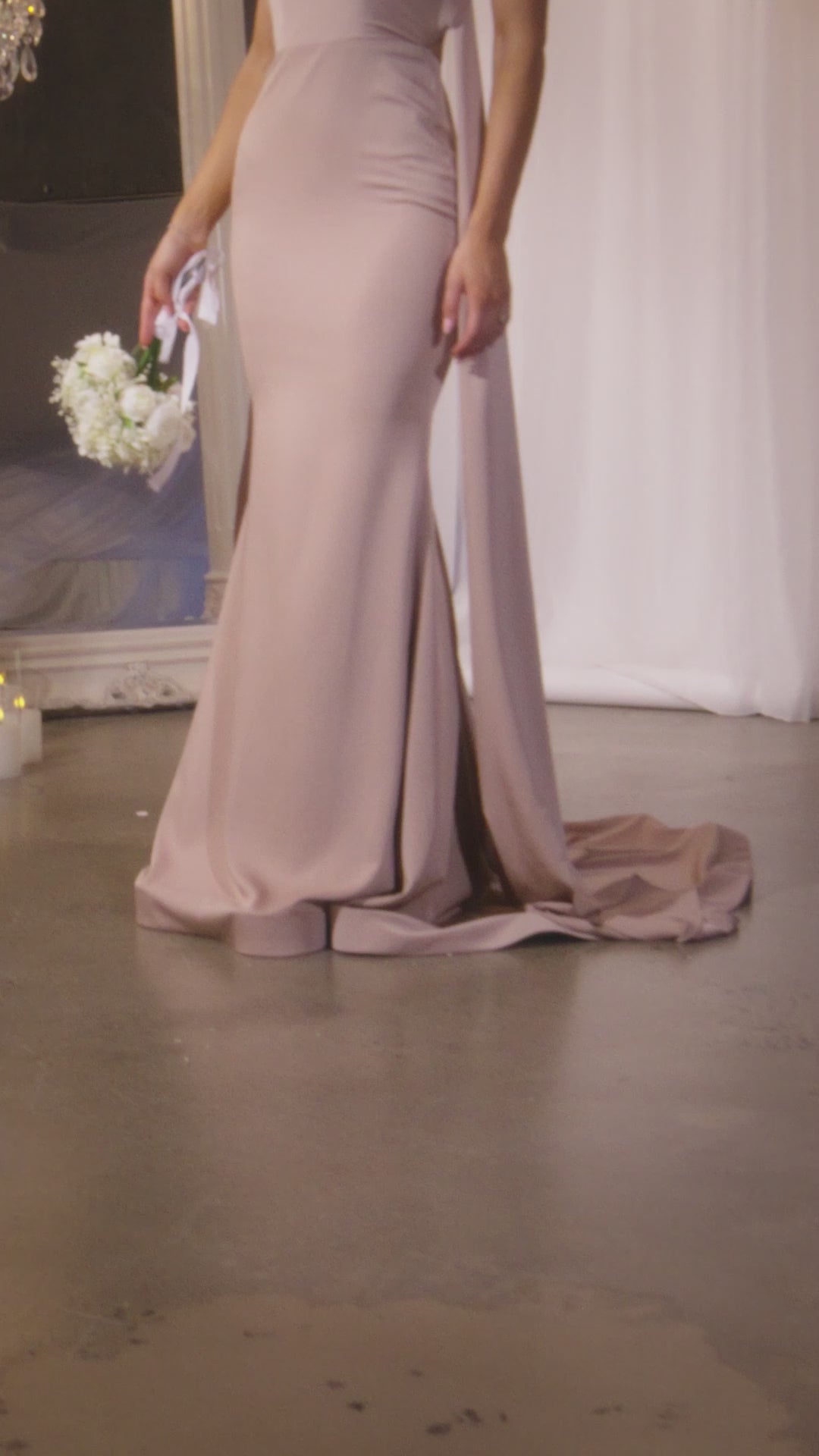 Introducing the Liana - a striking one-shoulder, high-neck design that exudes modern sophistication. The form-fitting silhouette is complemented by an open back, while two dramatic side trains attached to the back straps create a breathtaking effect as your bridesmaids move. The gown is finished with an additional train at the back, adding an extra touch of glamour and drama.