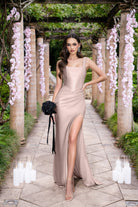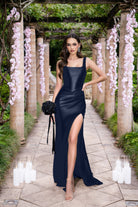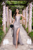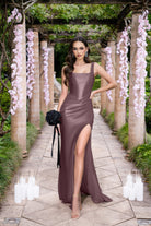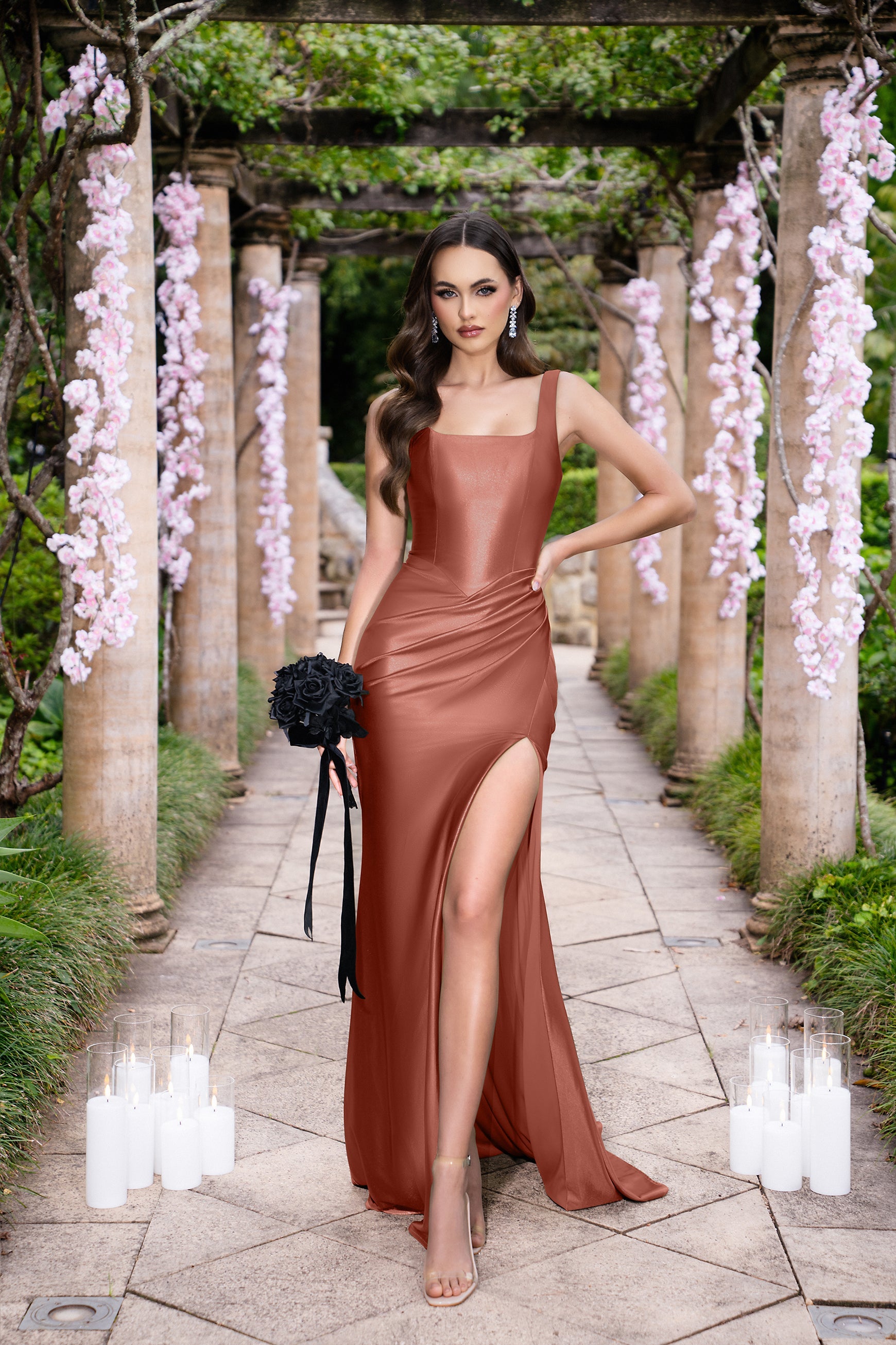 Introducing the Madelyn ‚is a perfect balance of classic elegance and modern allure, designed to make every bridesmaid feel effortlessly chic. The gown features a sleek, straight-across neckline with stylish thick straps for both comfort and support. The flattering waistline dips into a subtle V, while delicate ruching across the stomach enhances your natural shape. A daring high slit adds just the right amount of drama, and the slight train at the back ensures a graceful finish as you move. With its full-length design, the Madelyn offers a perfect fit that is both comfortable and captivating, ideal for a day full of unforgettable moments.