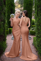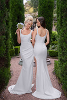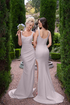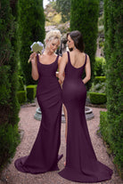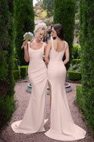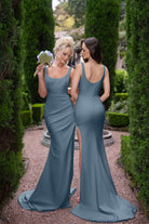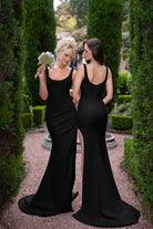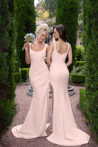 Introducing the Pamela, a stunning choice that combines timeless elegance with modern flair. This floor-length fitted dress features a graceful scoop neckline and slight ruching at the hips, creating a flattering silhouette that accentuates every curve. The elegant curved side slit adds a hint of allure, making it perfect for dancing the night away. While the Pamela has a structured fit with no stretch, its classic design ensures your bridesmaids will exude confidence and style. Elevate your bridal party look with the effortless sophistication of the Pamela!