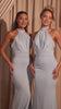 The Parker Gown is crafted from stretch satin and features a high halter neckline with soft pleating through the bodice. The open back is finished with long draped ties, adding a refined touch. The fitted silhouette extends into a floor-length skirt with a subtle train, offering a sleek and elegant bridesmaid look.