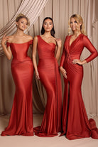 The Stevie Gown RIGHT is made from stretch satin and features a plunging V-neckline with gathered detailing through the waist for a flattering fit. The long sleeves balance the sleek silhouette, while the front split and floor-length hem add a touch of drama. A sophisticated and elegant choice for bridesmaids or evening occasions.