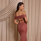 The Zoe Gown is made from stretch chiffon and features an off-shoulder neckline with layered detailing that drapes softly across the bust and arms. The fitted silhouette hugs the figure and flows into a subtle train, while the open back with crossover straps adds a modern touch. A sleek and romantic choice for bridesmaids.