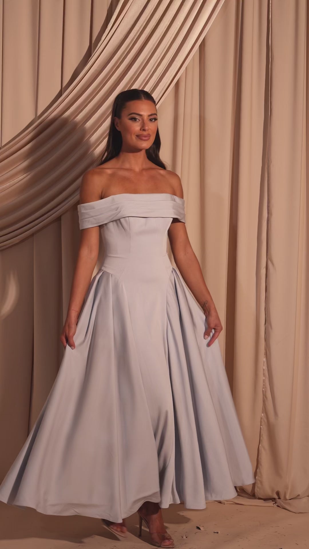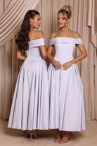 The Callie Dress is crafted from stretch satin and features an off-shoulder neckline with a folded band detail and a fitted bodice that accentuates the waist. The full A-line midi skirt falls beautifully with soft pleating for volume and movement, making it a timeless and elegant choice for bridesmaids.