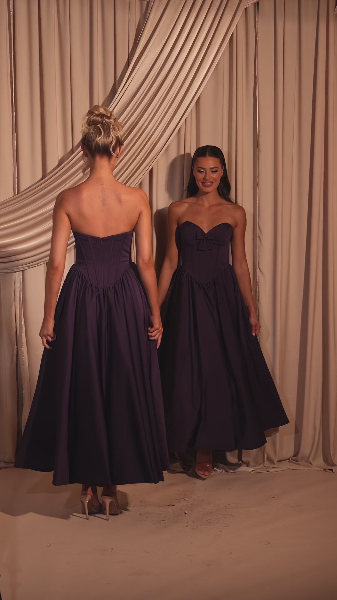 The Emma Gown is crafted from stretch satin and features a structured bodice with visible seam detailing and a sweetheart neckline adorned with a statement bow. The fitted waist flows into a full A-line skirt that moves beautifully with every step. A playful yet elegant gown, perfect for modern bridesmaids..