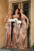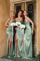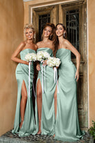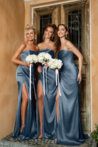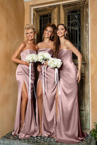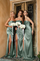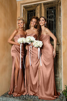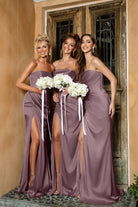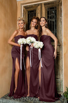 Introducing the Estelle, a show-stopping choice that perfectly balances sophistication and allure. This strapless fitted gown features a beautifully rouged bodice and hips, creating a flattering silhouette that enhances every curve. The daring high slit adds a touch of drama, while the subtle train at the back brings an elegant flow to each step. With a structured fit, the Estelle ensures your bridesmaids will radiate confidence and grace throughout your special day. Let them shine in the timeless beauty of the Estelle Gown!