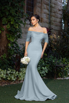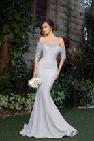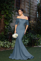 Introducing the exquisite Evelyn, a captivating choice for your bridesmaids that combines elegance and modern flair! This off-the-shoulder mermaid gown features enchanting medium-length sleeves crafted from delicate mesh that gracefully stop at the elbow, offering a touch of sophistication. The fitted silhouette beautifully highlights the figure, making it a flattering option for all body types. With its sleek design and timeless charm, the Evelyn ensures your bridesmaids will feel effortlessly chic and confident as they celebrate your love story in style. Perfect for any wedding setting, this gown is destined to be a showstopper!