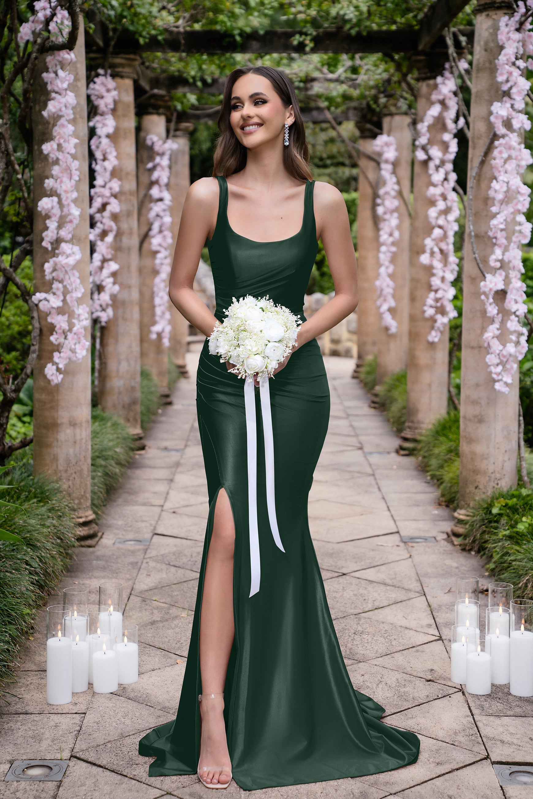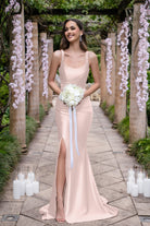 Introducing the Isadora Gown (or PS22228): a breath-taking floor-length masterpiece designed to flatter every bridesmaid. With its elegant scoop neckline and gentle ruching at the hips, this fitted bridesmaids dress creates a stunning silhouette that moves beautifully. The alluring curved side slit adds a touch of modern sophistication, while the medium stretch fabric ensures comfort and ease of movement throughout the celebration. This fitted bridesmaids dress is perfect for a bride who wants her bridesmaids to look and feel their best on her special day. The scoop neckline adds a touch of elegance, while the gentle ruching at the hips creates a flattering silhouette for all body types. Whether your bridesmaids are petite or curvy, this dress is designed to complement and enhance their natural beauty.