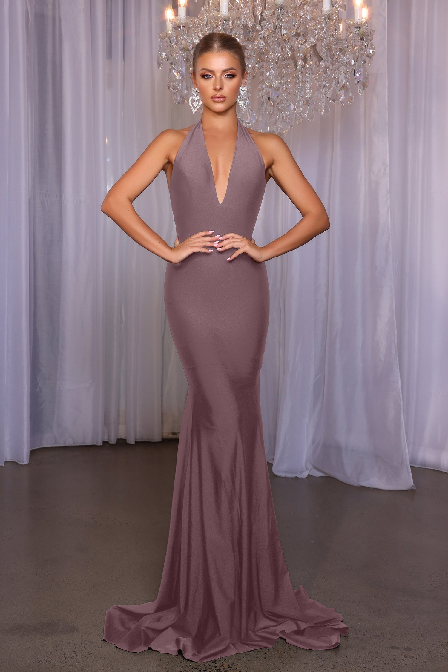 Introducing the Karla, a captivating floor-length dress that embodies elegance and style for your bridal party. Featuring a striking V front halter neck, this gown beautifully accentuates the shoulders while providing a flattering fit. The slight train adds a touch of drama, making it perfect for any wedding celebration. With a convenient center back zipper and high stretch fabric, the Karla offers both comfort and ease, allowing your bridesmaids to dance the night away with confidence. Elevate your wedding aesthetic with this stunning choice that combines sophistication and grace!