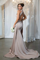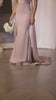 Introducing the Liana - a striking one-shoulder, high-neck design that exudes modern sophistication. The form-fitting silhouette is complemented by an open back, while two dramatic side trains attached to the back straps create a breathtaking effect as your bridesmaids move. The gown is finished with an additional train at the back, adding an extra touch of glamour and drama.