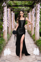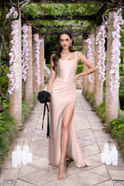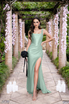 Introducing the Madelyn ‚is a perfect balance of classic elegance and modern allure, designed to make every bridesmaid feel effortlessly chic. The gown features a sleek, straight-across neckline with stylish thick straps for both comfort and support. The flattering waistline dips into a subtle V, while delicate ruching across the stomach enhances your natural shape. A daring high slit adds just the right amount of drama, and the slight train at the back ensures a graceful finish as you move. With its full-length design, the Madelyn offers a perfect fit that is both comfortable and captivating, ideal for a day full of unforgettable moments.