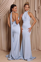 The Parker Gown is crafted from stretch satin and features a high halter neckline with soft pleating through the bodice. The open back is finished with long draped ties, adding a refined touch. The fitted silhouette extends into a floor-length skirt with a subtle train, offering a sleek and elegant bridesmaid look.